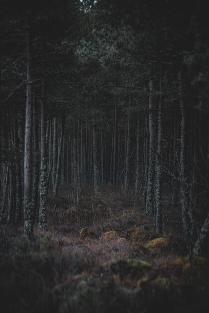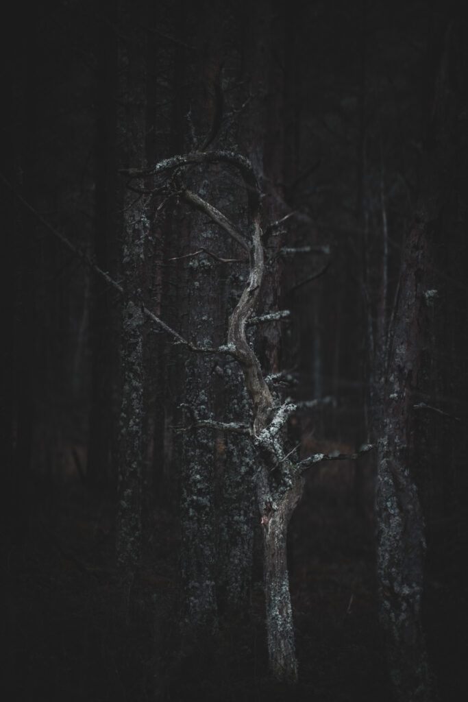 One of the standout motifs in Rae Raba is the oddly shaped, lichen-covered pine trunks. Their silhouettes look dramatic against the darker background — perfect for moody forest photography.